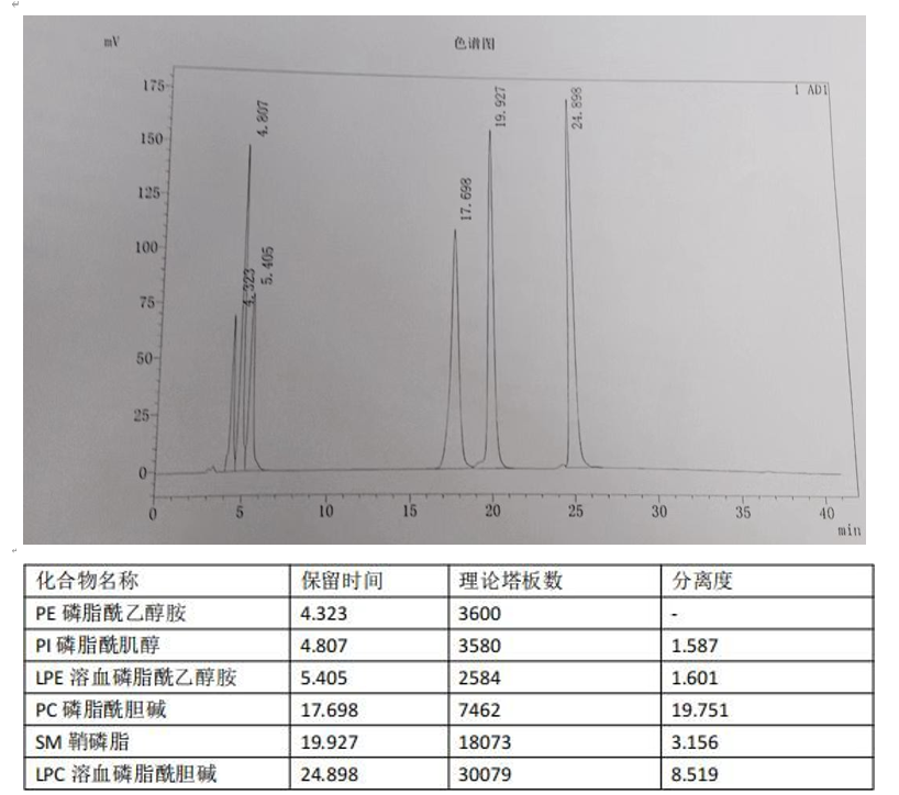 A 相:甲醇-水-冰醋酸-三乙胺(85∶15∶0.45∶0.05) B 相:以正己烷-異丙醇- 流動相 A(20∶48∶32) 各成分分離度應符合要求,理論板數按磷脂酰膽堿峰、磷脂酰乙醇胺峰與磷脂酰肌醇峰計算均不低于 1500。 ![]() |